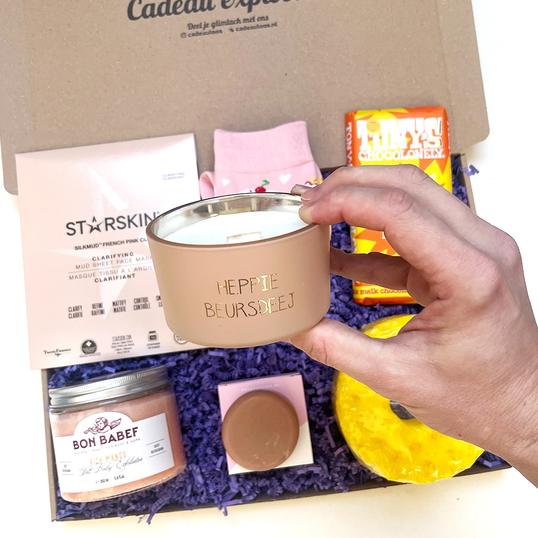 Deze box zit vol vrolijke verrassingen en luxe verwenmomenten die haar laten stralen op haar speciale dag. Van een luxe modder gezichtsmasker en een heerlijke mango scrub tot een feestelijke “Heppie Beursdeej” geurkaars die meteen voor sfeer zorgt. Trek de vrolijke verjaardagssokken aan, plant de bloembommetjes voor een blijvende herinnering en geniet samen van een Tony’s chocoladereep met een knipoog. Als finishing touch zit er een mango bodybuffer in voor een zachte, verzorgde huid.