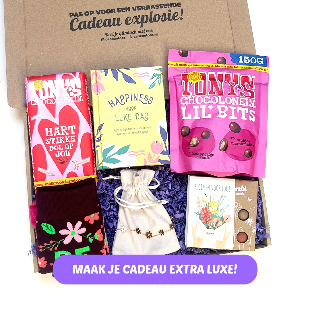Dit brievenbuscadeau zit vol kleine geluksmomentjes. Een gouden bloemen armband om te stralen, iets lekkers om van te genieten, vrolijke sokken met een positieve boodschap en bloembommetjes om letterlijk iets moois te laten groeien.