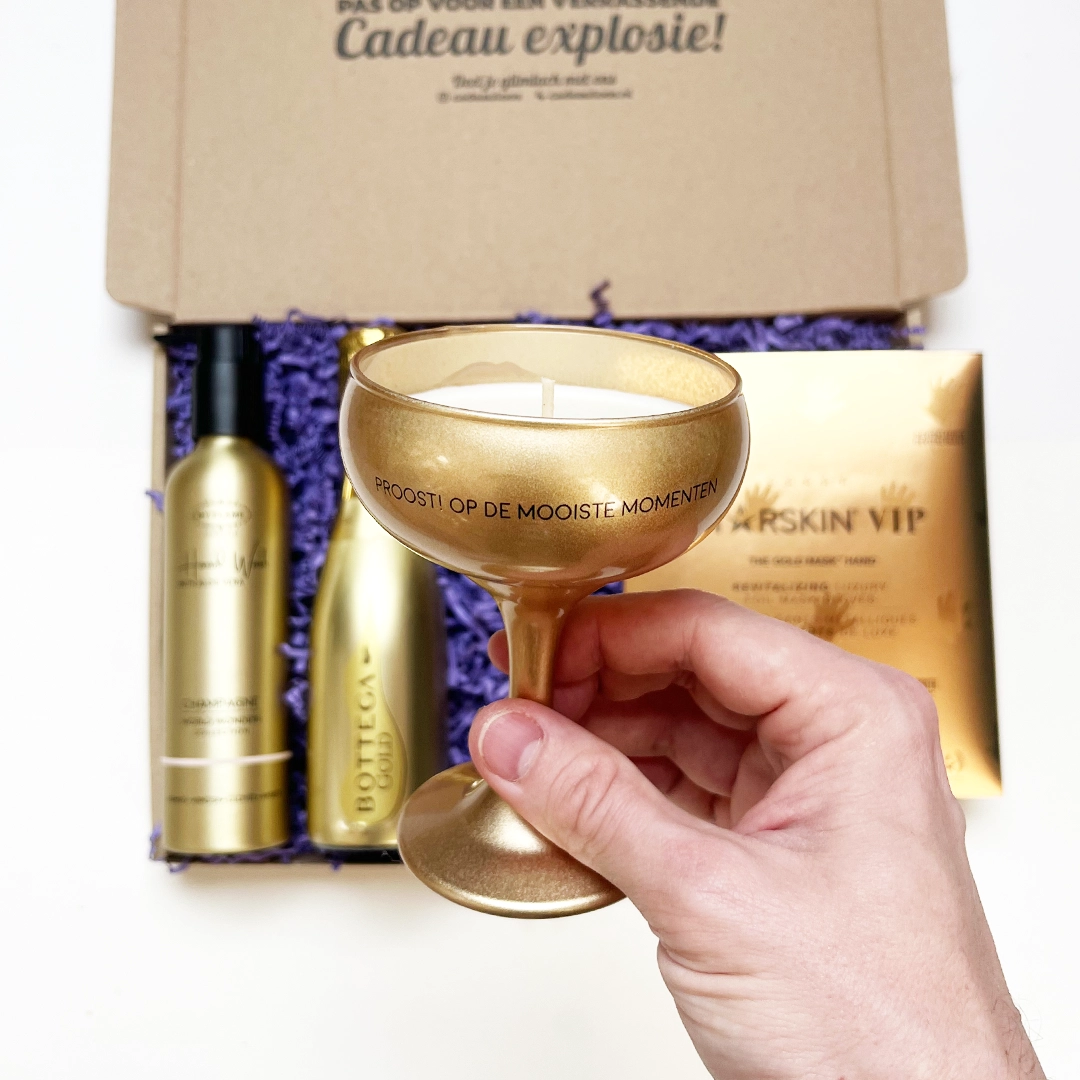 Open de fles Bottega prosecco en proost op het moment. Terwijl de unieke champagne geurkaars in een echt champagneglas een warme sfeer creΓ«ert, zorgen de gouden handzeep en het verzorgende handmasker voor een heerlijk verwenmoment.