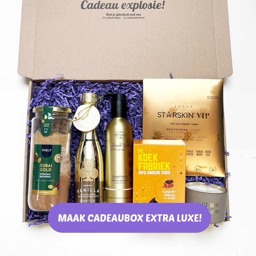 In deze box vind je een frisse champagne handzeep, een verzorgende gouden douchegel en een luxe gouden handmasker voor een heerlijk verwenmoment. Ondertussen geniet je van de karamel zeezout koekjes met chocolade, een perfecte combinatie van zoet en een klein beetje zout. De geurkaars met de tekst βJij bent goud waardβ maakt het helemaal af en zorgt voor een warme, gezellige sfeer.