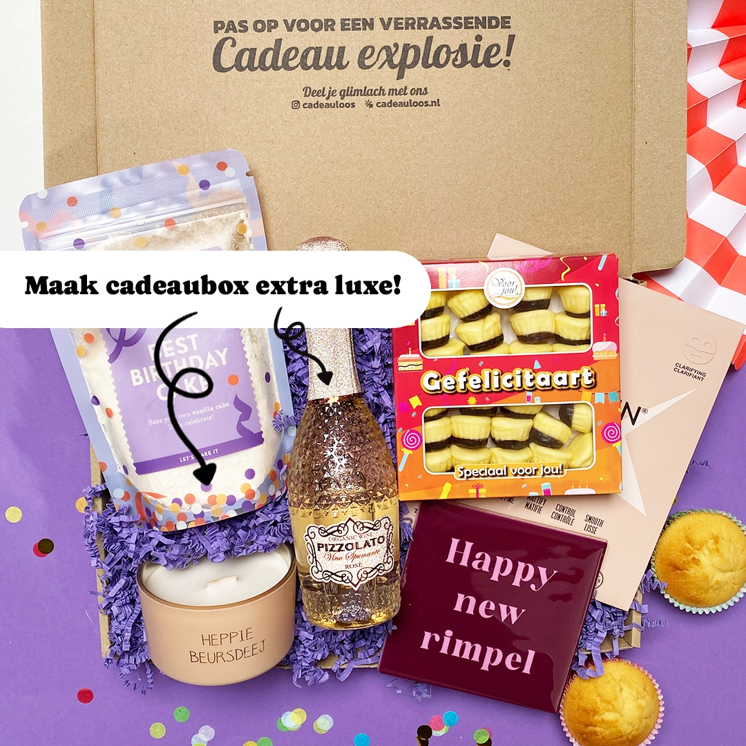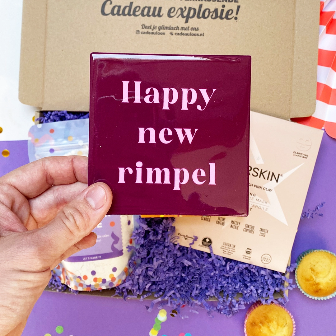 Verjaardagen zijn er om gevierd te worden, en met deze box wordt ouder worden alleen maar leuker. Trakteer haar op een luxe gezichtsmasker dat die rimpeltjes verwent, vrolijke verjaardagssokken om mee te stralen en een uniek Happy New Rimpel-tegeltje dat zorgt voor een glimlach. Natuurlijk kan snoep niet ontbreken: de hilarische Gefelicitaart-snoepjes en de onweerstaanbare Tony’s Chocolonely Bits met marshmallow & biscuits maken dit feestje compleet. En voor een vleugje vrolijkheid op de langere termijn? De feestelijke bloembommetjes die uitgroeien tot kleurrijke bloemen.