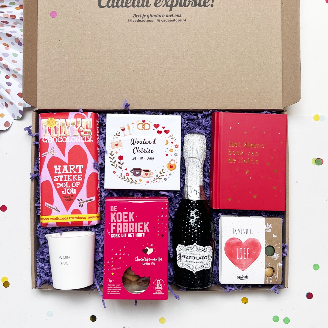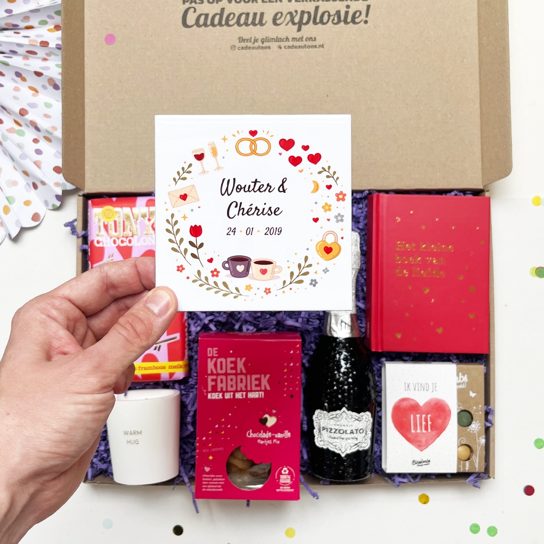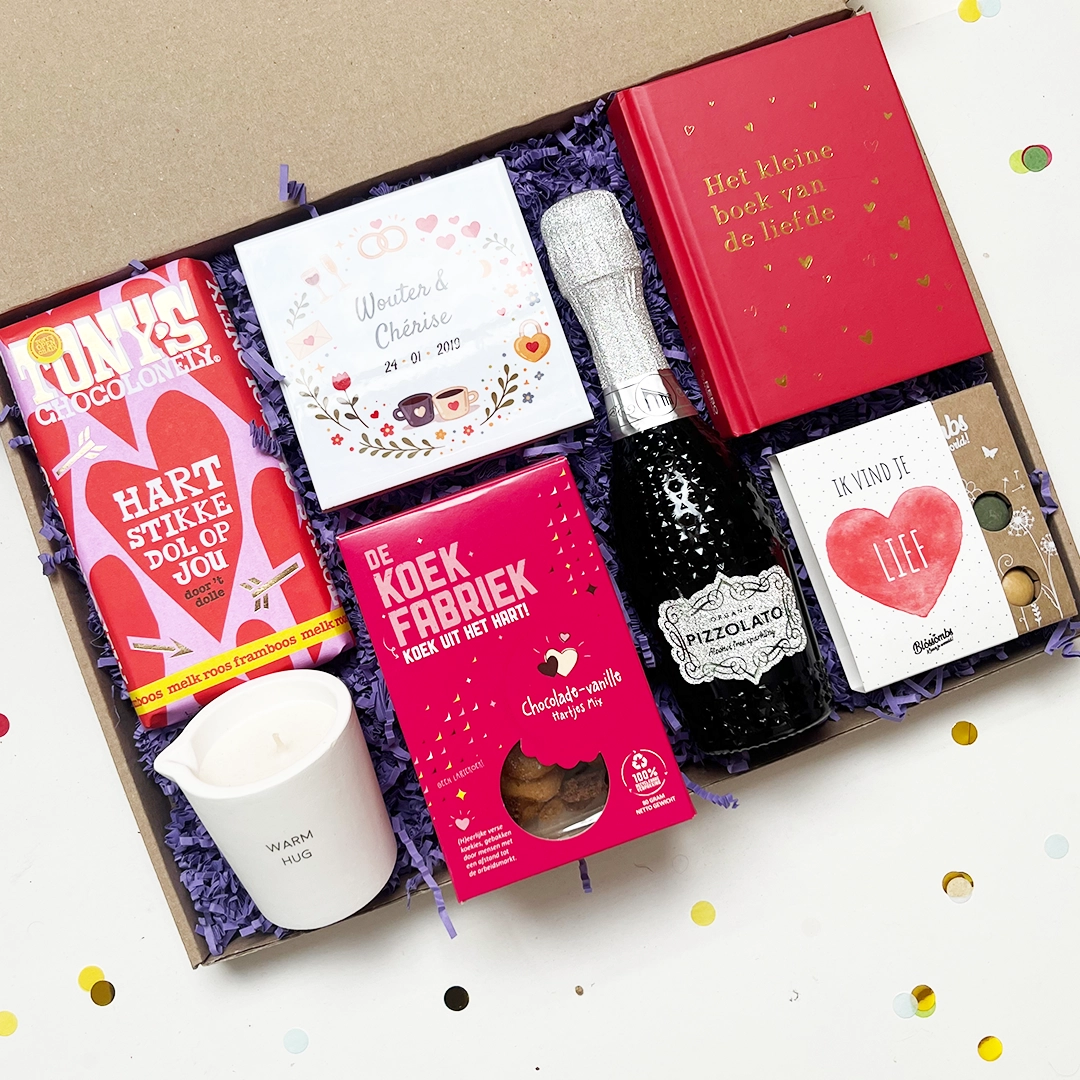 Deze cadeaubox zit vol romantische en fijne verrassingen om echt even samen te genieten. Met een persoonlijk tegeltje met namen en datum, een massagekaars voor een ontspannen moment, een Tony’s Chocolonely “Hartstikke dol op jou” reep, harten koekjes, een alcoholvrij bubbeltje, Het kleine boek van de liefde en lieve bloembommetjes.