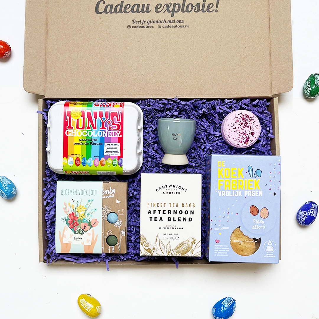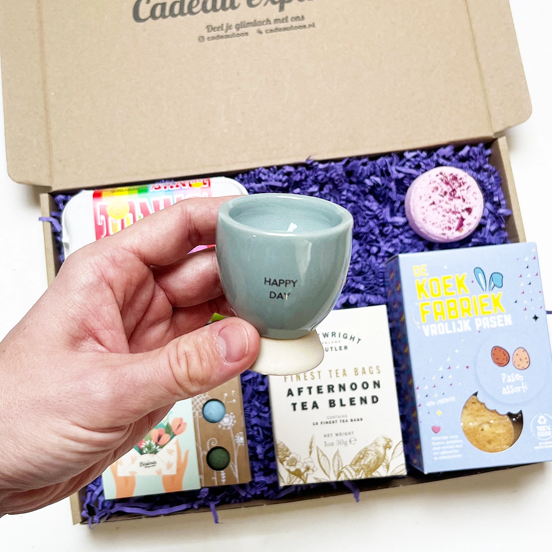 Iemand verrassen met Pasen? Met deze vrolijke cadeaubox geef je een doosje vol lentegevoel. Een mix van kleine geluksmomentjes die zorgen voor een glimlach. Van iets lekkers tot een beetje verwennerij voor thuis.