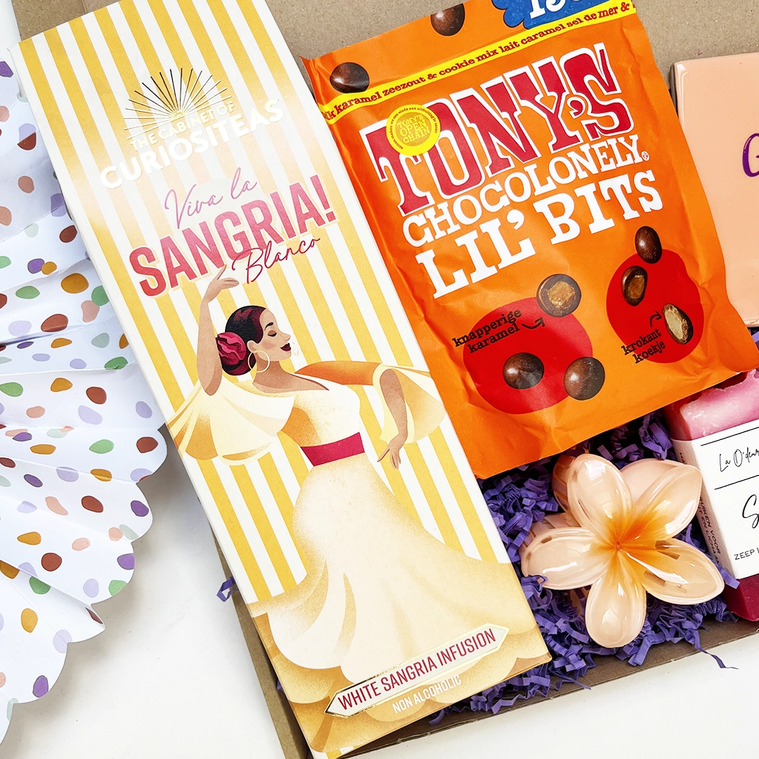 Maak je eigen frisse thee sangria, pak er iets lekkers bij en neem een momentje voor jezelf. Alles in deze box voelt licht, vrolijk en precies wat je nodig hebt om even op te laden.