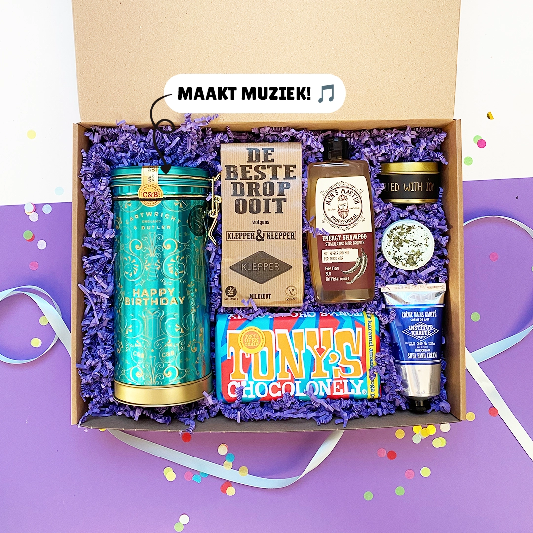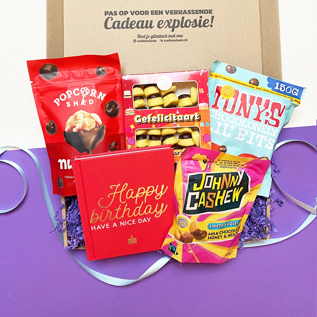 Verjaardagscadeautje per post voor een feestje Bij een verjaardagscadeautje per post wil je dat de confetti direct in de rondte springt. De jarige moet kunnen lachen, verrast zijn en zich echt speciaal voelen. Dat doen wij met onze cadeauboxen per post. Onze feestelijke boxen zitten vol leuke cadeautjes die perfect passen bij de jarige en die je zelfs zelf kunt samenstellen. Afgewerkt met een handgeschreven kaartje wordt het helemaal persoonlijk, zodat jouw cadeau een glimlach bezorgt vanaf het moment dat de doos wordt geopend.